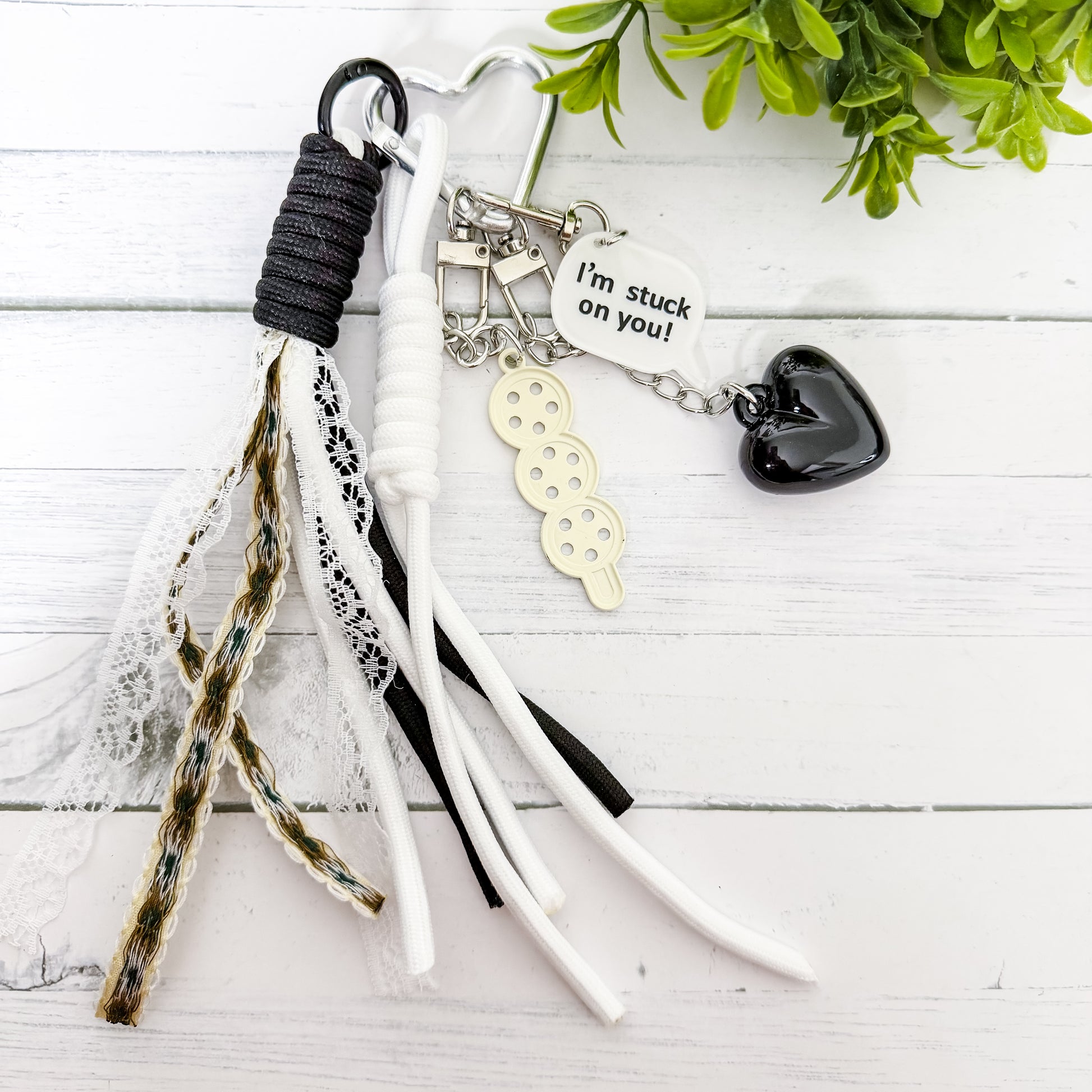 This version includes: black and white corded textures, lace accents, mixed metal hardware, and layered charm details.