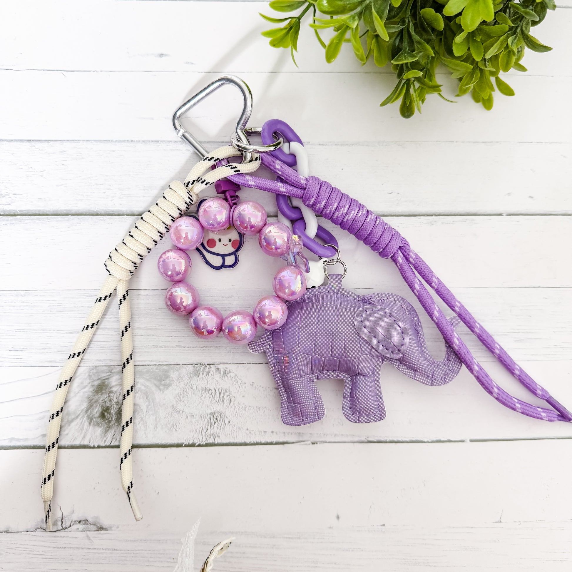 This version includes: layered corded textures, acrylic chain links, iridescent bead accents, and a stitched elephant charm.