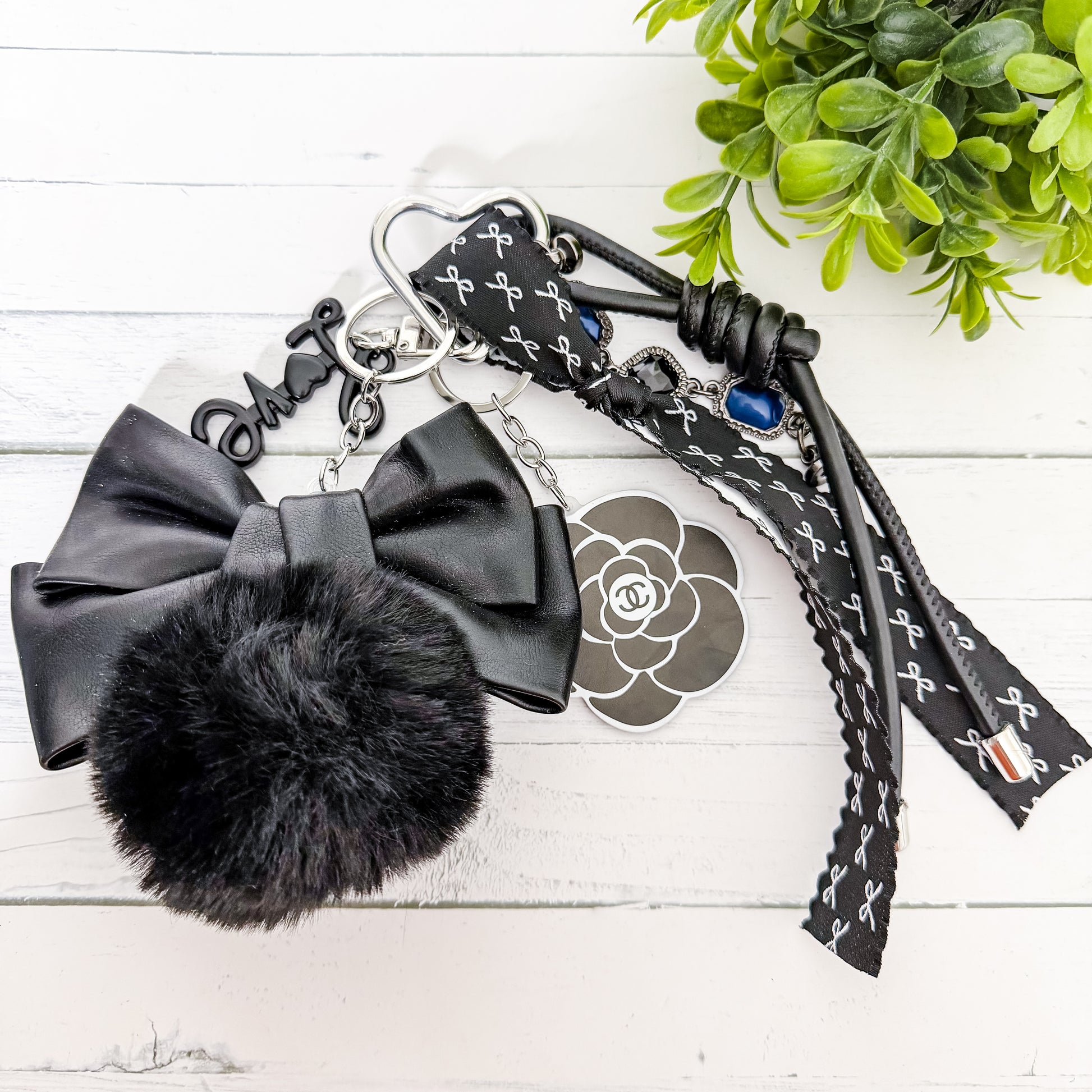This version includes: black-toned textures, faux leather accents, ribbon details, a soft faux fur element, layered charms, and mixed metal hardware.
